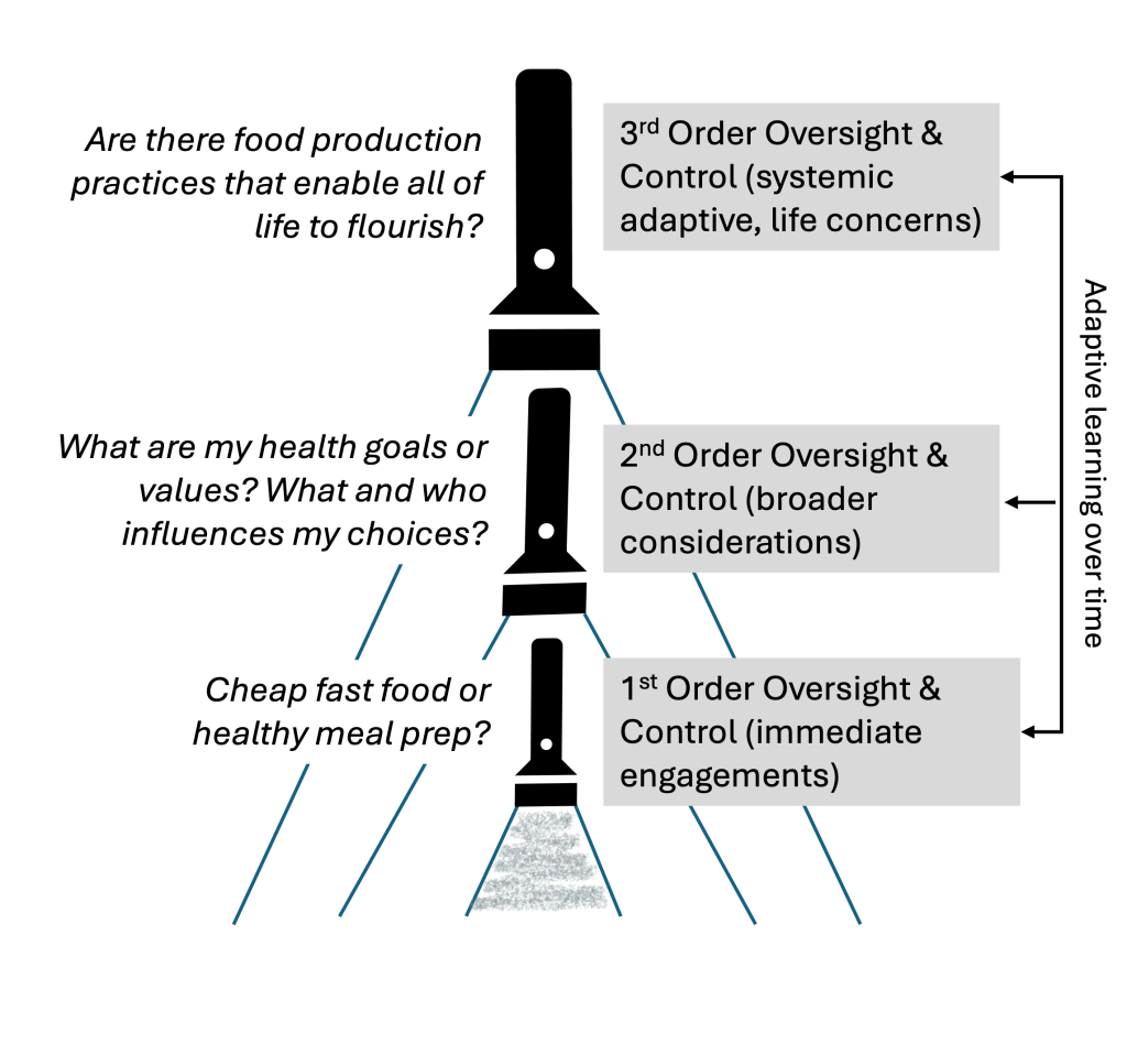 Our challenge today is that much of the social-cultural influences guiding our thoughts and actions at the 1st and 2nd levels of oversight and control are resulting in devastating consequences for our species and planet. For instance, unfettered capitalism and consumption values result in factory farming and monoculture crops putting the food systems we depend on and our health at risk. We need a higher level of oversight, or “meta” oversight, that supports wise action to prevent disaster, course correct, and design better ways of living on this planet. This meta level of oversight is the top flashlight, the 3rd level of oversight and control or systemic adaptive oversight and control. In the case of food production systems and institutions, we must extend the scope of consideration beyond the corporate bottomline to that of life and humanity. Oversight mechanisms at a systemic adaptive level would consider what is best for all of life to flourish, not just shareholders and fulfilling short-term financial and food production goals. The 3rd order of oversight and control is the frontier of human and social development.